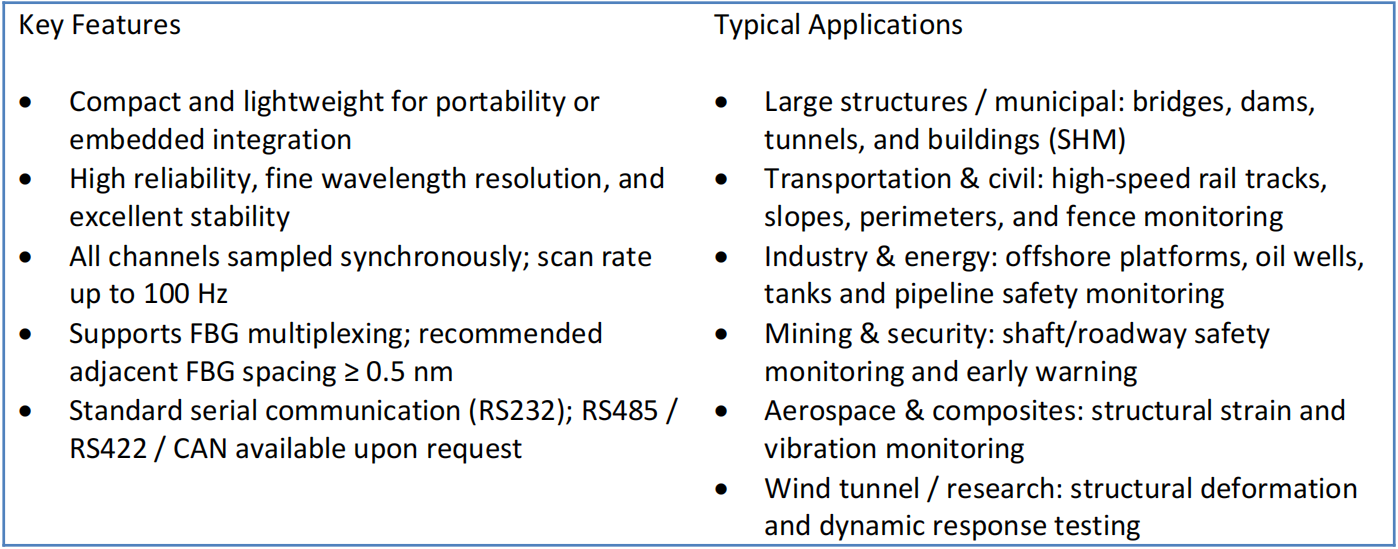 FXFBG-100-2 is a portable interrogator designed for Fiber Bragg Grating (FBG) sensing, well-suited for embedded integration and field measurements. It offers synchronized acquisition, high stability and fine resolution, applicable to civil engineering, energy and industry, rail transportation, aerospace, and research scenarios.