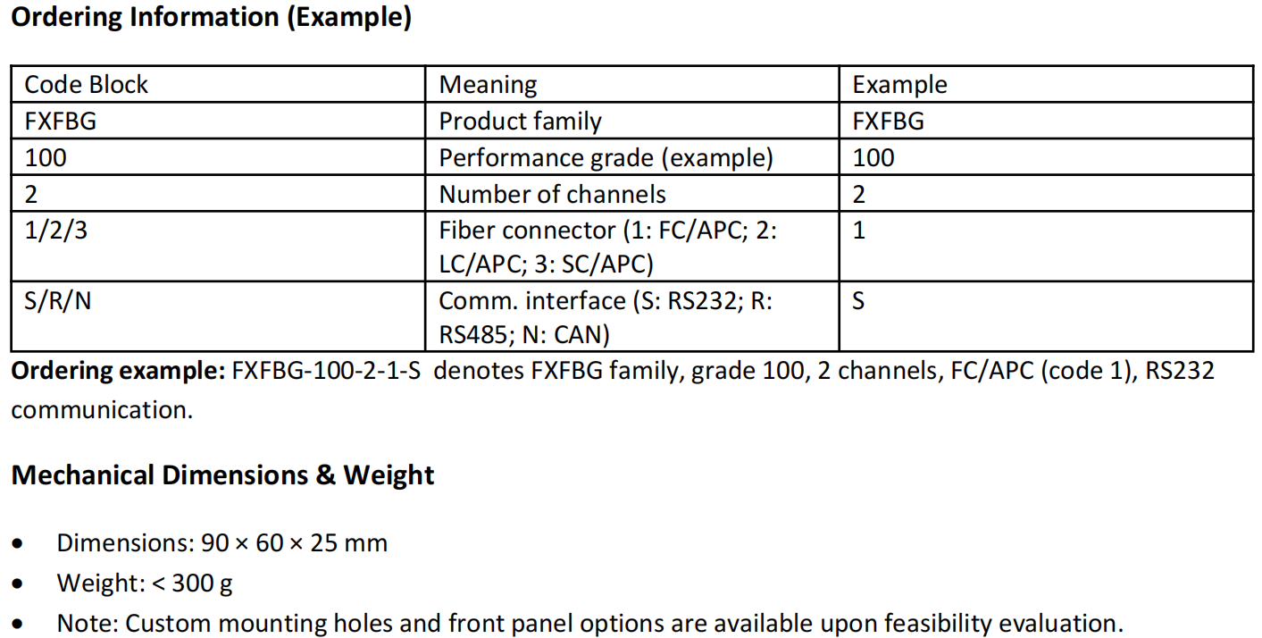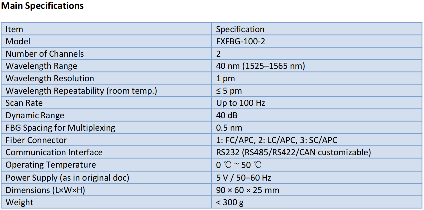 ·Tip: For best performance, keep adjacent FBG peak spacing ≥ 0.5 nm and minimize extra loss and reflections from connectors and patch cords.